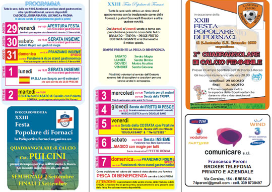L’Oratorio di Fornaci presenta… XXIII FESTA POPOLARE DI FORNACI, come ogni anno l’ oratorio vi offre 10 giorni di grande festa con stand gastronomico, eventi e molto altro ancora! Da VENERDI’ 29 AGOSTO a DOMENICA 7 SETTEMBRE tutte le sere con oltre 100 volontari troverete: la pesca di beneficenza, le lotterie istantanee e un ricco stand gastronomico con tradizionale carne delle Fornaci, i tipici casoncelli bresciani e molte altre sorprese… con tutti i posti al coperto e servizio ai tavoli!