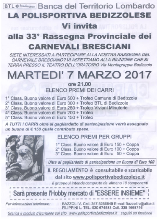 Domenica 12 marzo alle ore 13.00 torna per la 33° edizione la Rassegna Provinciale del Carnevale Bresciano con la sfilata dei carri in Località San Rocco