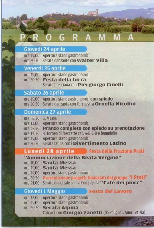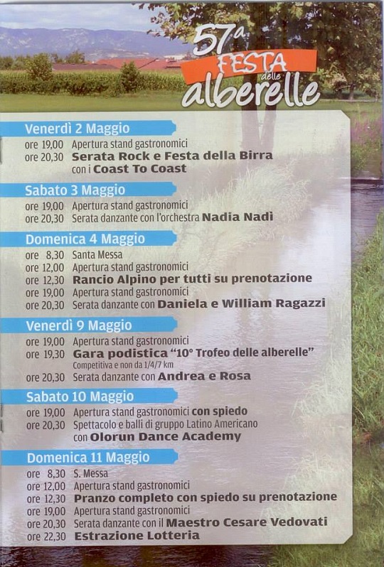 Il Gruppo “I Prati” organizza la 57 Festa delle Alberelle nei giorni dal 24 al 28 Aprile, dall’1 al 4 e dal 9 al 11 Maggio 2014 nella Frazione Prati di Calcinato .