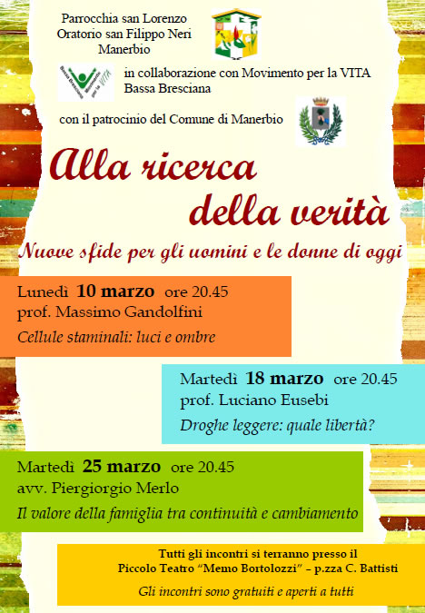 La Parrocchia di Manerbio con il Movimento per la Vita della Bassa Bresciana propongono Alla Ricerca della Verità, nuove sfide per gli uomini e le donne di oggi. In programma per il 10, 18 e 25 marzo 2014 i 3 incontri gratuiti vogliono approfondire i temi: Cellule staminali, droghe leggere e il valore della famiglia. Presso il Teatro di Manerbio