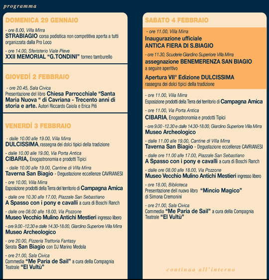 Da venerdì 3 a domenica 5 febbraio a Cavriana in provincia di Mantova, è in programma l’Antica fiera del patrono San Biagio, con Taglio e distribuzione gratuita maxi torta di San Biagio in Piazza Castello e molti altri eventi.