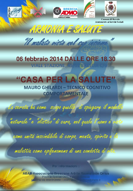 Giovedì 6 febbraio 2014 alle ore 18.30 presso la Casa per la Salute di Viale Stazione a Brescia è in programma una serata informativa dal tema Armonia e Salute… il malato visto nel suo insieme, a cura di Ghilardi Mauro, tecnico cognitivo comportamentale. Al termine della serata ci sarà un piccolo rinfresco. Ingresso libero.