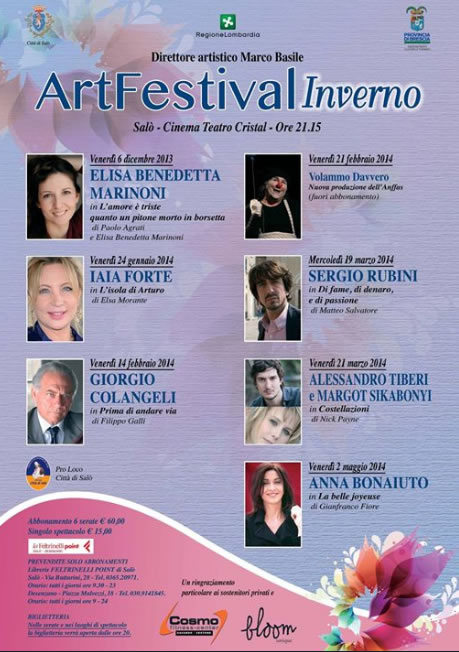 Da venerdì 6 dicembre 2013 a venerdì 2 maggio 20014 torna la rassegna teatrale Art Festival Inverno. Gli spettacoli si terranno presso il Cinema Teatro Cristal di Salò.