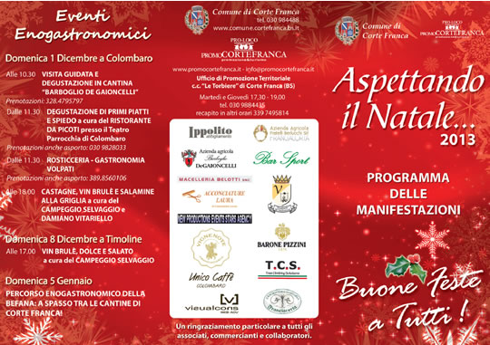 Il Comune e la Pro Loco di Corte Franca organizzano tanti eventi con Aspettando il Natale… 2013, il programma ricco di enogastronomia, tradizione e folklore prevede: visite guidate con degustazioni, percorsi enogastronomici, mercatini di antiquariato, modernariato e natalizi, raduno di Babbi Natale, concerti e molto altro