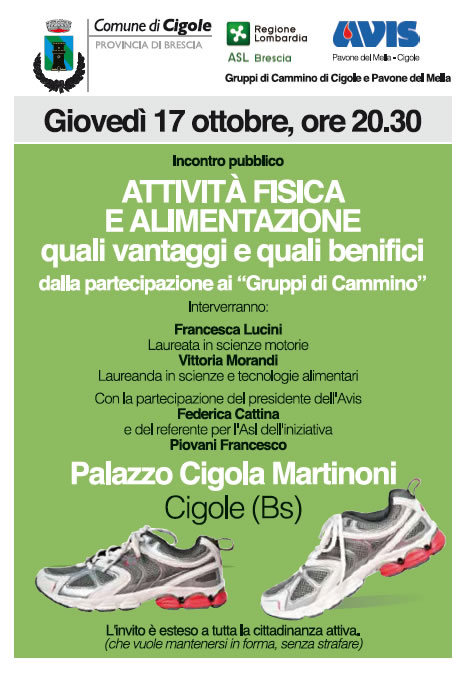 Giovedì 17 ottobre alle ore 20.30 presso il Palazzo Cigola Martinoni di Cigole ci sarà l’ incontro pubblico dal titolo Attività Fisica e Alimentazione quali vantaggi e quali benefici