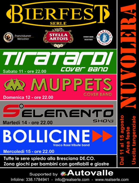 Dall’11 al 15 Agosto a Serle c’e il BIERFEST SERLE con i suoi casoncelli , la specialità dello spiedo alla bresciana e soprattutto le sue birre quest’anno si spostano nell’area eventi / feste di Nuvolera a pochi metri dall’uscita della tangenziale. per info consultare il sito WWW.REALSERLE.com in programma dall’11 al 15 Agosto 2012.