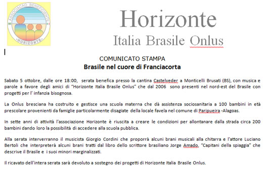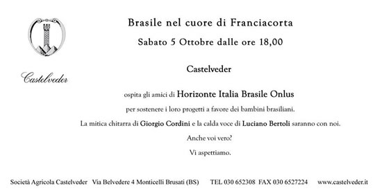 Sabato 5 ottobre 2013, Brasile nel Cuore di Franciacorta, a Monticelli Brusati presso la cantina Castelveder dalle ore 18.00 serata di beneficenza con musica, parole e vino per raccogliere fondi a favore degli amici di Horizonte Italia Brasile Onlus