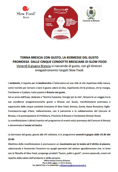 Venerdì 6 giugno 2014 torna per la 19° edizione Brescia Con Gusto, con gli itinerari enogastronomici. Per partecipare è possibile acquistare il menù-percorso con il kit d’assaggio al costo di €40,00 – per i soci Slow Food a €35,00 presso l’Info Point di via Trieste angolo piazza Duomo, online dal sito www.slowfoodbrescia.it oppure se ancora disponibili la sera stessa dell’evento, al desk Slow Food in Piazza della Loggia.