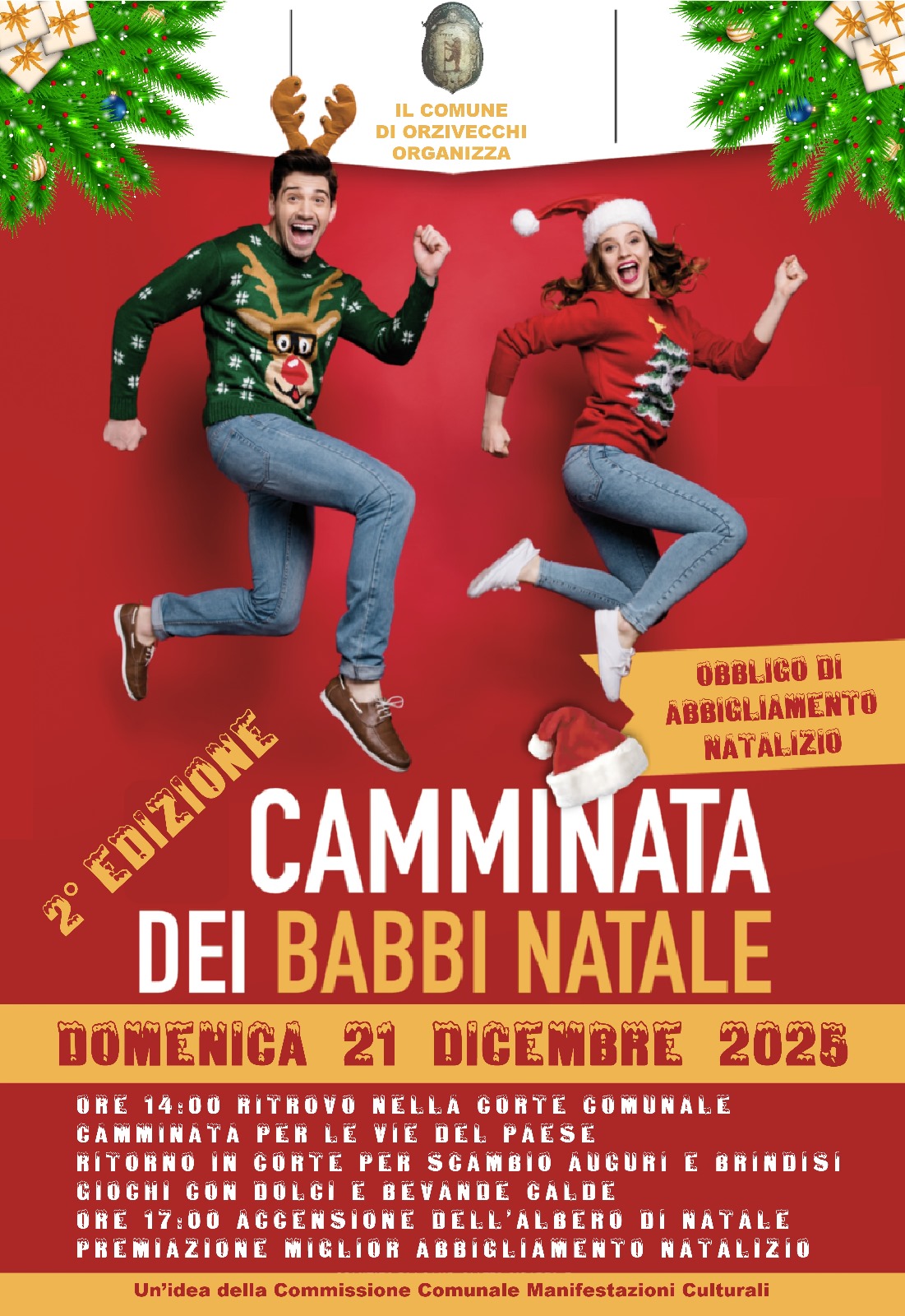 Seconda edizione della camminata dei Babbi Natale. Ritrovo nella corte comune di Palazzo Martinengo, a Orzivecchi, partenza per un giro a piedi di quaranta minuti circa con visita ad un caratteristico presepio. Alle 17,00 premiazione e accensione dell’albero di Natale. Obbligatorio abbigliamento natalizio.