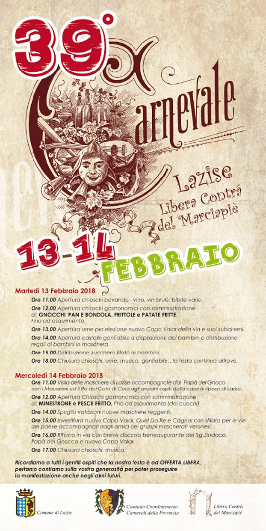 Martedì 13 e mercoledì 14 febbraio a Lazise è in programma la 39° edizione del Carnevale del Marciapiè