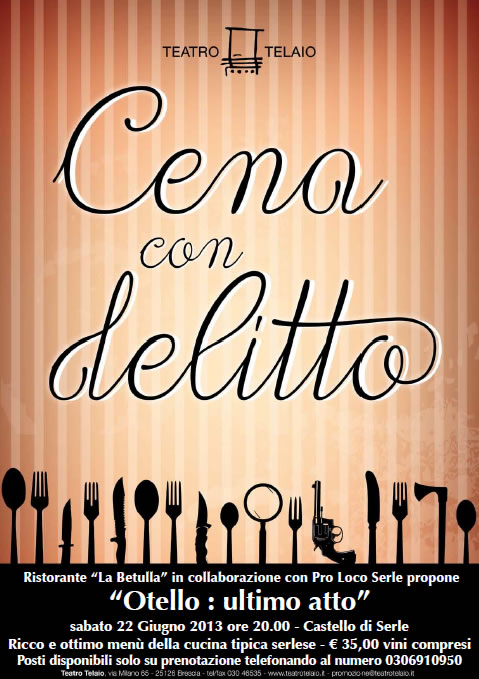 Il ristorante La Betulla e la Pro Loco di Serle propongono per sabato 22 giugno presso il Castello di Serle, Cena con Delitto – Otello Ultimo Atto. € 35,00 per un menù ricco compreso di vino.
