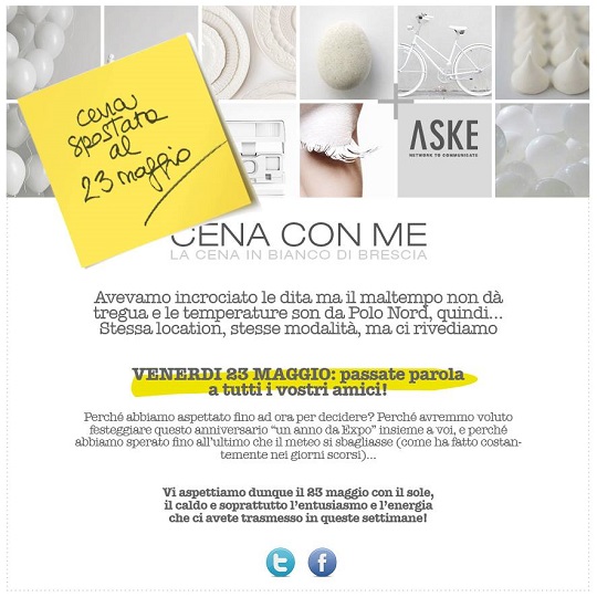 Dopo il successo dello scorso anno Mercoledì 30 Aprile 2014 torna Cena con me a Brescia ,un modo per vivere uno spazio della nostra città: noi vi diamo l’appuntamento… l’evento lo create voi!