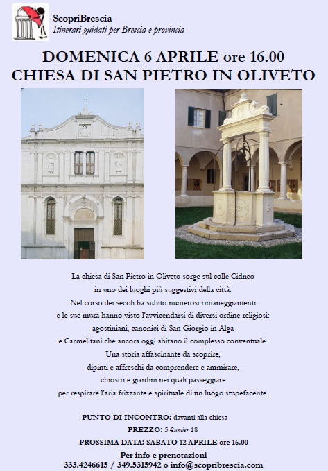 Domenica 6 aprile 2014 nel pomeriggio alle ore 16,00 le guide turistiche di ScopriBrescia propongono una visita alla chiesa e ai chiostri del complesso di San Pietro in Oliveto: un luogo dalla storia affascinante che custodisce dipinti e affreschi meravigliosi, tra cui la celebre cappella di San Barnaba.