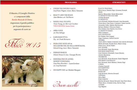 Domenica 28 dicembre 2014 alle ore 20.45 presso il Centro Polifunzionale di Berzo Demo, la Banda Musicale v’invita al tradizionale Concerto Augurale diretto dal Maestro Damiano Pe