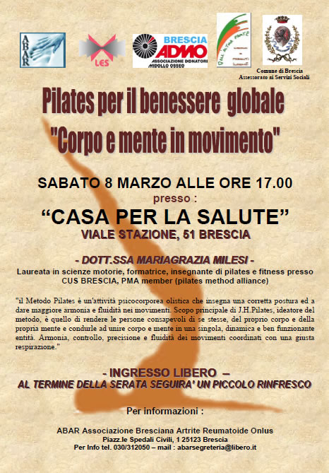 In data sabato 8 marzo 2014 alle ore 17.00 presso la Casa per la Salute in Viale Stazione 51, si svolge la Serata informativa dal tema: Pilates per il benessere globale, Corpo e Mente in Movimento a cura di Mariagrazia Milesi. Ingresso libero, al termine della serata ci sarà un piccolo rinfresco.