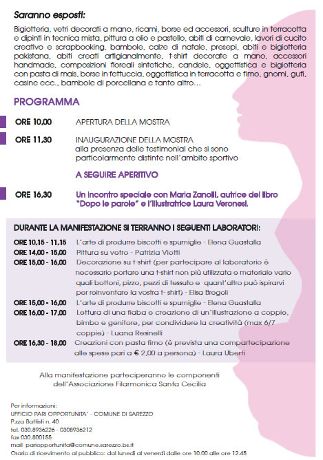 Domenica 6 ottobre 2013 alle ore 10.00 al Palazzo Avogadro di Sarezzo torna per la 10 edizione Creatività al Femminile, un’ esposizione di hobbistica, bigiotteria, accessori, sculture, dipinti, bambole, artigianato, arte e molto altro, inoltre durante la manifestazione si potrà partecipare ai laboratori.