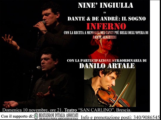 Domenica 10 novembre, al teatro SAN CARLINO di Brescia, Ninè Ingiulla racconta la cantica dell’Inferno di Dante Alighieri e ne reciterà a memoria più di mille versi. Il tutto accompagnato dall’esecuzione di brani di Fabrizio De Andrè insieme al noto compositore cantautore polistrumentista Danilo Artale che eseguirà dei pezzi straordinari con il suo violino.