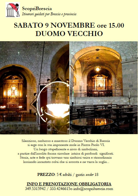 Sabato 9 novembre alle ore 15.00 le guide turistiche di ScopriBrescia ci propongono un grande classico: il Duomo Vecchio per chi non avesse ancora avuto occasione di visitare un edificio suggestivo, testimonianza di arte, storia e fede. Appuntamento all’ingresso del Duomo, costo 5 €/gratis under 18.