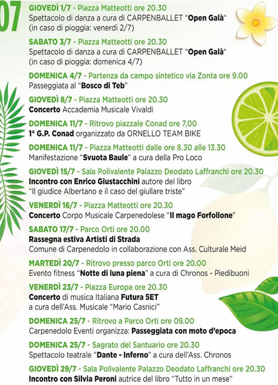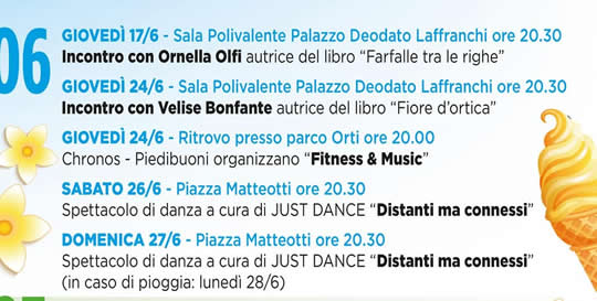 Per tutti gli eventi in piazza Matteotti, piazza della Chiesa e piazza Europa, i posti a sedere saranno limitati ad un massimo di 150 persone, l’ingresso sarà contingentato con prenotazione obbligatoria. L’accesso del pubblico avverrà previo rilievo della temperatura e nel pieno rispetto delle disposizioni vigenti al momento dell’evento in programma.