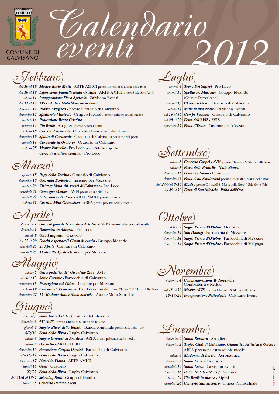 Calendario completo degli eventi 2012 nel Comune di Calvisano. Un ricco programma di eventi, sagre, manifestazioni e feste. Per informazioni clicca qui per scaricare la locandina in formato PDF.
