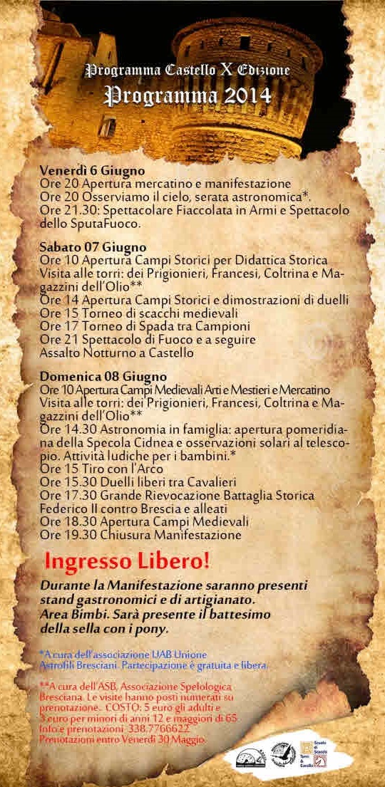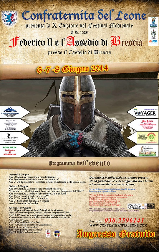 La confraternita del Leone nei giorni 6-7-8 Giugno 2014 presenta la X edizione del Festival Medioevale con A.D. 1238 Federico II e l’assedio di Brescia una tre giorni di rievocazioni medioevali con tornei e spettacoli a tema