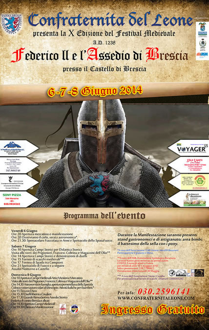 Venerdì 6, sabato 7 e domenica 8 giugno 2014 la Confraternita del Leone propone la 10° edizione del Festival Medievale con Federico II e L’Assedio di Brescia. Presso il Castello verranno allestiti mercatini e campi storici, inoltre il programma dell’evento prevede: tornei di spada, spettacoli con il fuoco, duelli tra cavalieri, tiro con l’arco e molti altri eventi collaterali.