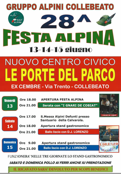 Venerdì 13, sabato 14 e domenica 15 giugno 2014 il Gruppo Alpini di Collebeato organizza la 28° edizione della Festa Alpina presso il nuovo centro civico Le Porte del Parco con stand gastronomico e serate danzanti