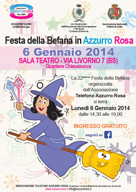 L’Associazione Telefono Azzurro Rosa onlus organizza la 22° edizione della Festa della Befana, in programma per lunedì 6 gennaio 2014 dalle ore 14.30 presso la Sala Teatro in via Livorno 7 nel quartiere Chiesanuova, dove ci saranno esibizioni di danza moderna, pesca di beneficenza, gonfiabili, palloncini, truccabimbi e tanto divertimento