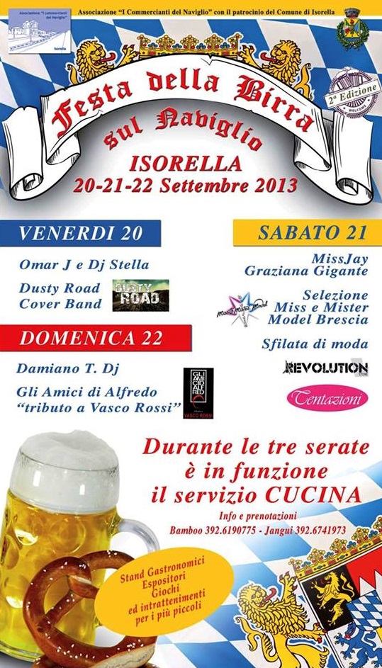 Il 20-21-22 settembre 2013 torna a Isorella nella sua 2 edizione la Festa della birra sul Naviglio organizzata dai commercianti di Isorella con ottima birra, intrattenimento Musicale di prim’ordine e addirittura un concorso di Bellezza .