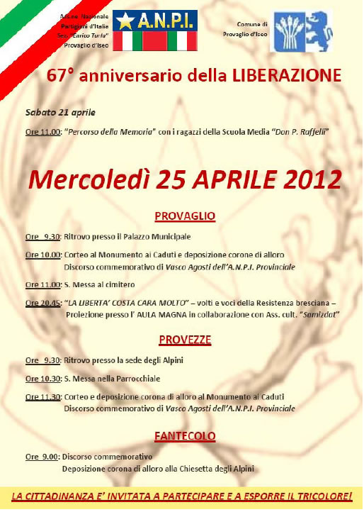 La celebrazione ufficiale della Festa di Liberazione, nella giornata di mercoledì 25 aprile, prevede durante la mattinata un fitto programma di cerimonie promosse a