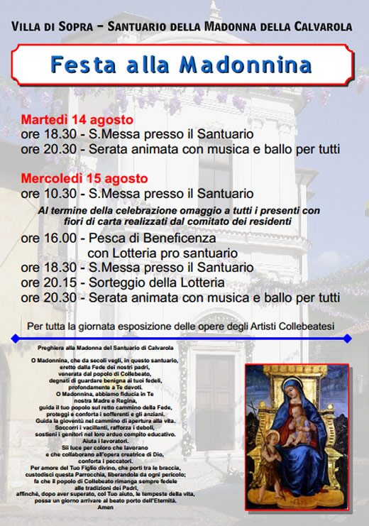 In programma Martedì 14 e Mercoledì 15 Agosto la Festa alla Madonnina presso Villa di Sopra di Collebeato. Per maggiori informazioni consulta il sito del Comune.