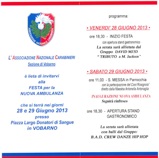 L’ Associazione Nazionale Carabinieri di Vobarno organizza la Festa Nuova Ambulanza, in programma per venerdì 28 e sabato 29 giugno in Piazza Largo Donatori di Sangue a Vobarno con Stand gastronomico e musica.