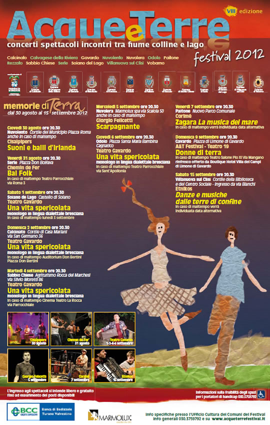 In programma dal 30 Agosto al 15 Settembre 2012 la manifestazione Acque e Terre. Per maggiori informazioni consulta il sito www.acqueterrefestival.it oppure contatta la Segreteria organizzativa: mail info@acqueterrefestival.it tel. 030.3759792