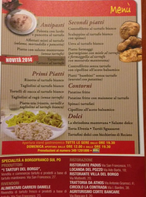 Nei giorni: 3 – 4- 5 – 10 – 11 -12 – 17 – 18 – 19 – 20 ottobre 2014 Borgofranco sul Po in provincia di Mantova ospita la 20° Fiera del Tartufo presso la tensostruttura in Piazza Malavasi. Il programma prevede: gare e dimostrazioni di ricerca del tartufo con cani, convegni, animazione, mercatini, raduno di auto, spettacolo fontane danzanti e stand gastronomico