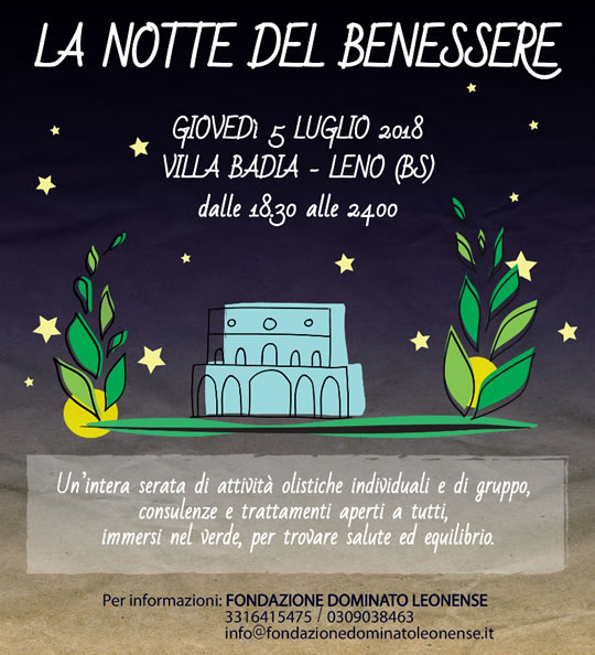 Dal 5 all’8 luglio presso Villa Badia a Leno è in programma la Fiera di San Benedetto: Avvicinarsi alla natura è la strada maestra per raggiungere uno stato di vero benessere. Questa condizione impone uno stile di vita sostenibile ed una consapevolezza in merito alle scelte di acquisto e di produzione. Promuovere questo modus vivendi è pertanto fondamentale. Per questo motivo torna a Leno la Fiera di San Benedetto, mostra mercato del biologico, del benessere e della natura. La manifestazione, giunta quest’anno alla sua sedicesima edizione, ha l’obiettivo di valorizzare la produzione biologica di qualità ed essere una vetrina di prodotti, trattamenti ed attività del benessere, per ritrovare e mantenere l’equilibrio della mente, del corpo e dell’anima, nel rispetto della natura. Quattro giorni di manifestazione dedicati al benessere in tutte le sue forme. Una festa per tutti, nel corso della quale sarà possibile trovare il mercato dei prodotti bio e naturali, trattamenti olistici, attività del benessere ed un punto ristoro dove poter degustare piatti della cucina tradizionale e biologica a cura del Gruppo Alpini di Leno e tipicità vegane a cura di Gastrosofia Veg di Cigole. Prodotti biologici e naturali, ma non solo: riciclo creativo e artigianato, consulenze personalizzate, discipline olistiche, musica e buon cibo, il tutto nella splendida cornice del Parco di Villa Badia di Leno, sito archeologico del monastero di San Benedetto. La Fiera di San Benedetto aprirà le sue porte giovedì 5 luglio alle 18.30 con la seconda edizione de “La Notte del Benessere”: una giostra di attività olistiche individuali e di gruppo per approcciarsi a numerose discipline, come yoga, pilates, massaggi con campane tibetane e bagni di gong, riflessologia facciale e plantare, test con fiori australiani, shiatzu, jin shin do, trattamenti osteopatici, riequilibrio posturale, biodanza e molto altro ancora. “La notte del benessere” è promossa in collaborazione con il Centro Olistico “La Crisalide”, “Body Town Fitness and Wellness” e “Delacroix Natura” di Leno. Si prosegue venerdì 6 luglio, con l’inaugurazione della mostra d’arte dell’Associazione Artisti Bresciani dal titolo “Sguardi di Donna”: una collettiva curata dalla prof.ssa Milena Moneta che vedrà in mostra alcune delle più belle opere a tema femminile delle artiste Laura Benedetti, Giusi Lazzari, Manuela Marziali, Pinuccia Nicolosi e Lionella Parolari. La serata prosegue con il magico concerto “Siamo stati naviganti” a cura del gruppo StileLibero. Un itinerario tra ritmi e sonorità eterogenei, dal rock americano al jazz, dal pop inglese alla bossanova attraverso i ritmi latini, dalla canzone d’autore italiana alla ballata di matrice francese e della tradizione celtica. Sabato 7 luglio i cancelli di Villa Badia, del mercato e delle numerose dimostrazioni e prove di discipline olistiche e culinarie si aprono alle 18.30. La serata è animata dal concerto dell’Orchestra BandaFaber: oltre 60 elementi in scena per un viaggio tra le più belle canzoni del cantautorato italiano: da Lucio Battisti a Lucio Dalla, da Augusto Daolio, a Mina, a De Andrè a Giorgio Gaber. Domenica 8 luglio la giornata aprirà con la tradizionale Giornata della prevenzione LILT: dalle ore 8.30 sarà possibile effettuare visite mediche gratuite per la prevenzione senologica, cardiologica e diabetologia. Alle 12.30 pranzo insieme con lo spiedo a cura del Gruppo Alpini di Leno. La mostra mercato riapre nel tardo pomeriggio e alle 18.00 verranno presentati i nuovi risultati della campagna scavo dell’area nord di Villa Badia, che vedrà impegnati dal 25 giugno al 13 luglio gli archeologi per il quinto anno consecutivo nella ricerca dell’area artigianale del monastero benedettino lenese. La chiusura è affidata all’energia del “Concerto d’estate” del Corpo Musicale Lenese “V. Capirola”, che quest’anno porterà in scena nel tradizionale Concerto d’estate le più belle canzoni e storie di rinascita, nell’anno del centenario della Grande Guerra, in un magico duetto con il gruppo Les Omelettes. La manifestazione è ad ingresso libero. La Fiera di San Benedetto è organizzata da Fondazione Dominato Leonense, Cassa Padana, Gruppo Alpini sezione di Leno, Corpo Musicale Lenese “V. Capirola” e ProLoco di Leno, in collaborazione con LILT e con il patrocinio del Comune di Leno.