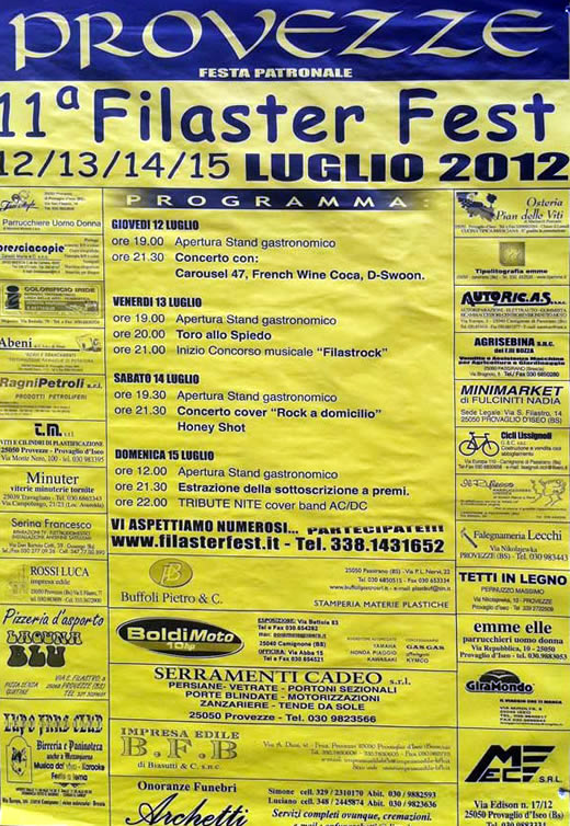 11a edizione della Filasterfest a Provezze (Provaglio d’Iseo) in programma dal 12 al 15 Luglio 2012. Per maggiori informazioni consulta il sito della manifestazione. www.filasterfest.it
