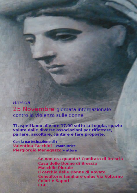 Lunedì 25 novembre 2013 è la Giornata Internazionale Contro la Violenza sulle Donne, le Associazioni: se non ora quando?, Casa delle Donne, Maschile Plurale, il Cerchio delle Donne, Consultorio onlus di via Volturno, Colori e Sapori e CGIL c’invitano in Piazza Loggia alle ore 17.00 per riflettere, parlare, ascoltare, cantare e fare proposte