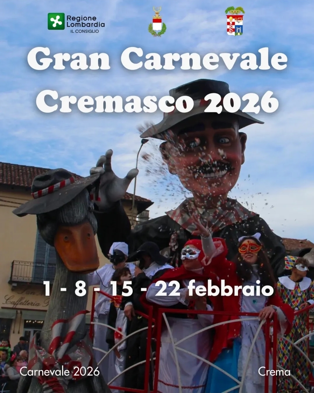 Il programma inizia domenica 1 febbraio con una festa dedicata ai bambini in piazza Duomo. A partire da domenica 8 febbraio prendono il via le sfilate dei grandi carri allegorici. L’evento celebra la tradizione del carnevale cremasco con animazione e spettacoli per il pubblico. https://www.instagram.com/grancarnevalecremasco/