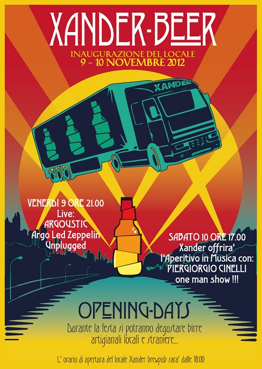 Venerdi 9 e Sabato 10 Novembre 2012 lo XANDER-BEER e felice di invitarCi alla sua inaugurazione in via Dalmazia 23/a intrattenendoci con le sue migliori birre e ottimi accompagnamenti musicali dal vivo : venerdi 9 ci saranno Argoustic – sabato10 ci sarà Piergiorgio Cinelli