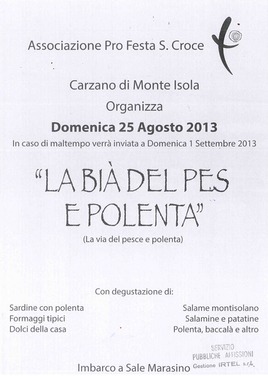 L’associazione ProFesta S. Croce organizza per domenica 25 Agosto 2013 La Bià del Pes e Polenta 2013 a Carzano di Monte Isola ovvero la Via del Pesce e della Polenta ….e molte altre specialità tipiche dell’isola