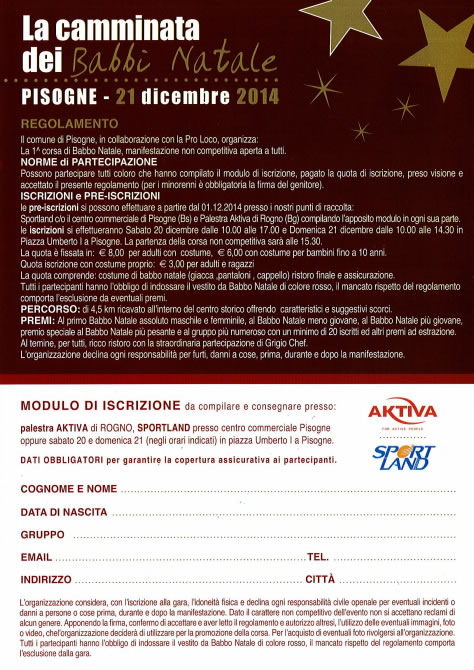 Domenica 21 dicembre 2014 Pisogne propone La Camminata dei Babbi Natale, una passeggiata non competitiva di 4,5 km aperta a tutti con partenza da Piazza Umberto I alle ore 15.30