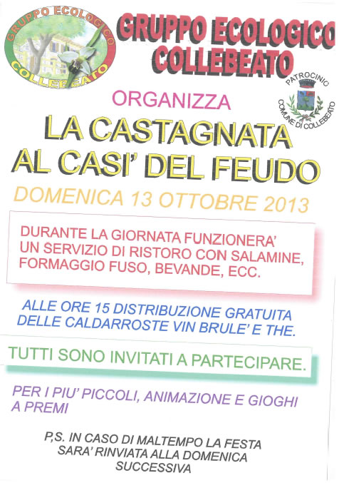 Il Gruppo Ecologico Collebeato organizza La Castagnata al Casi del Feudo per domenica 13 ottobre 2013, alle ore 15.00 distribuzione gratuita di caldarroste, vin brulè e the, inoltre durante la giornata funzionerà il servizio ristoro e l’ animazione con giochi a premi per i bambini