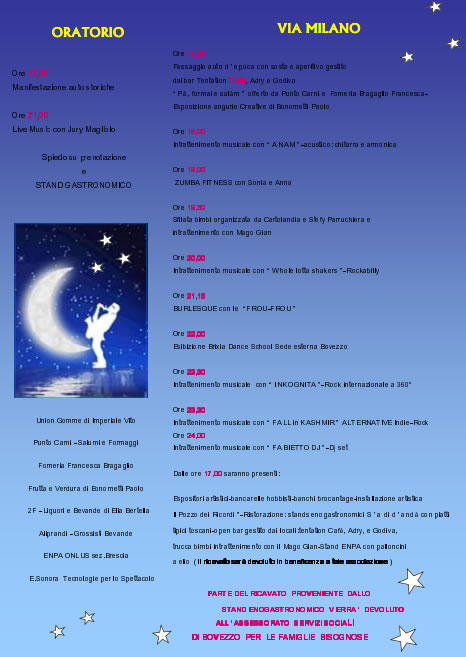 Sabato 6 settembre 2014 dalle ore 17.00 il Comune di Bovezzo organizza la 5° edizione della Notte Bianca. Il programma prevede: musica, concerti, esibizioni di ballo e sport, spettacoli e stand gastronomici.