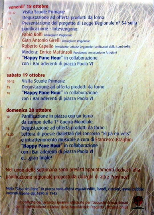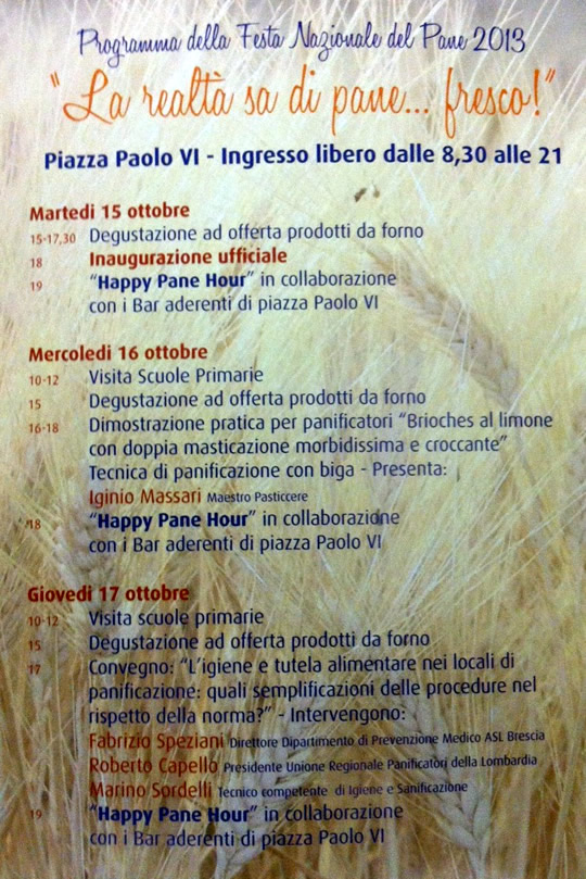 Da martedì 15 a domenica 20 ottobre 2013 in Piazza Paolo VI a Brescia torna La Realta sa di Pane…. Fresco, per l’ occasione verrà allestito un laboratorio con più forni per garantire ogni pomeriggio la degustazione di pane, pizze e focacce