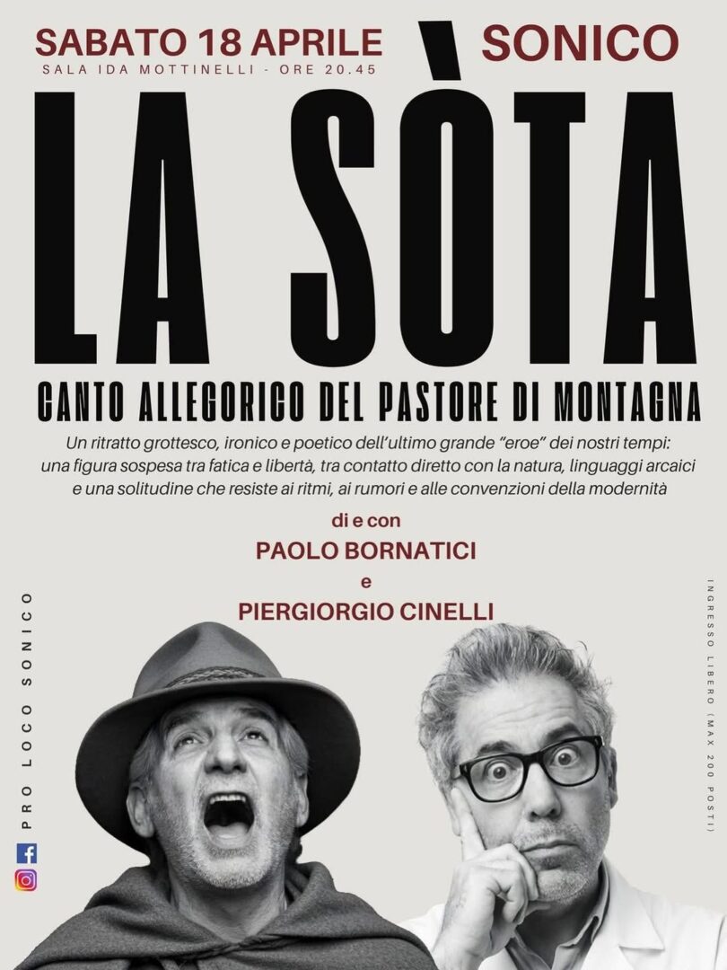 La Sòta arriva in anteprima sul palco della sala Ida Mottinelli di Sonico! Un canto irriverente e allegorico che dà voce senza filtri alla figura del pastore, tra ironia, provocazione e antiche verità. Uno spettacolo che profuma di montagna, di fatica, solitudine e… libertà.