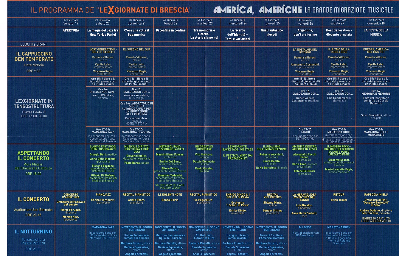 Da venerdì 19 a domenica 28 settembre 2014 il Centro Storico di Brescia accoglie Le X Giornate, dieci giorni dedicati alla musica tra concerti, conferenze, teatro, letteratura e spettacoli dal tema “America, Americhe la grande migrazione musicale”.