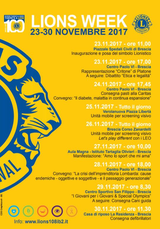 Da giovedì 23 a giovedì 30 novembre è in programma Lions Week, l’evento dedicato a far conoscere il Lions Club International e coinvolgere la gente sulle esigenze attuali quali il diabete, la difesa della vista e la disabilità. E non solo … in quei sette giorni i Lions si occuperanno anche dei giovani, per sensibilizzarli alla cultura dello sport, come conquista di vita, e per inculcare tra i ragazzi valori già da tempo sopiti.