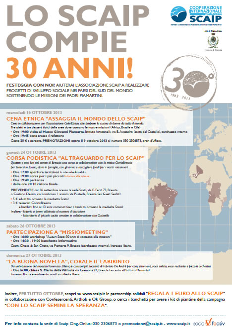 La Cooperazione Internazionale Piamartina Scaip per festeggiare 30 anni di progetti umanitari organizza Lo Scaip Compie 30 Anni, il programma degli eventi prevede una cena con pietanze e musiche etniche, una corsa podistica non competitiva e un concerto.