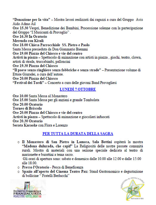 Da venerdì 4 a lunedì 7 ottobre 2013 torna la Madonna di Ottobre a Provaglio d’ Iseo, l’ importante ricorrenza religiosa e popolare presenta un programma ricco d’ iniziative: Concerti, animazione, arte in strada con i madonnari, giochi, truccabimbi, clown, teatro, mostre, stand gastronomico e degustazione bollicine