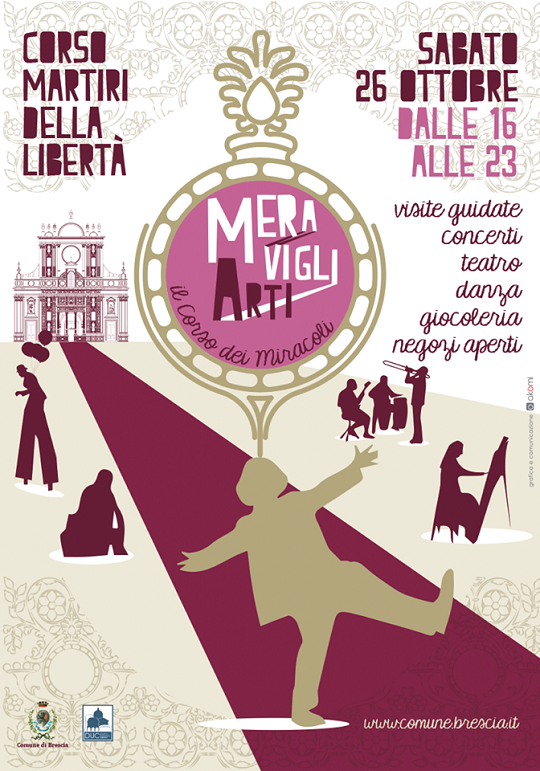 Meravigliarti 2013 Brescia : Sabato 26 ottobre 2013 Corso Martiri delle Libertà ospiterà una grande festa per inaugurare la riapertura della Chiesa di Santa Maria dei Miracoli, nel cuore di questa storica via. La musica darà il via ai festeggiamenti alle 16.00 e anticiperà le altre performance di artisti da strada che allieteranno i partecipanti per tutto il pomeriggio e dalle 19,00 La Fabbrica dei Talenti giovani promesse Bresciane si esibiscono condotte da Nicoletta Del Vecchio e Sara Prandelli (guarda la locandina sotto quella ufficiale dell’evento)